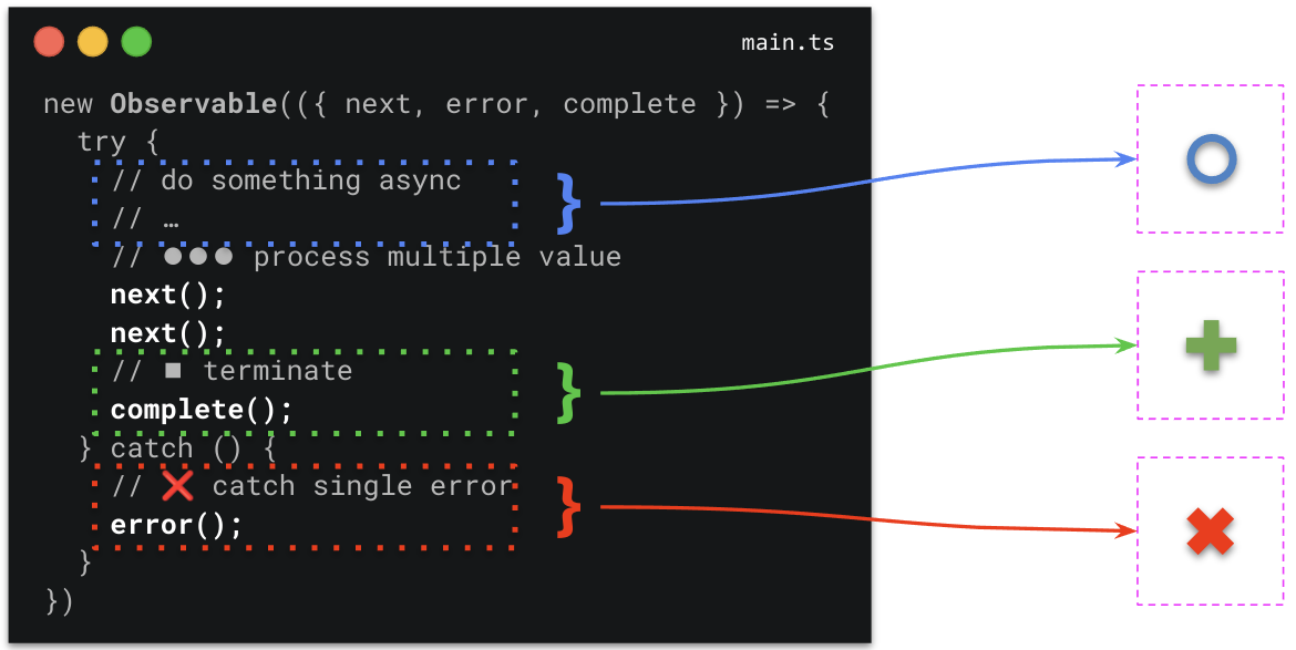 suspense=> the stream has not emitted data yeterror=> the stream encountered an errorcomplete=> the stream completed, won't emit another value